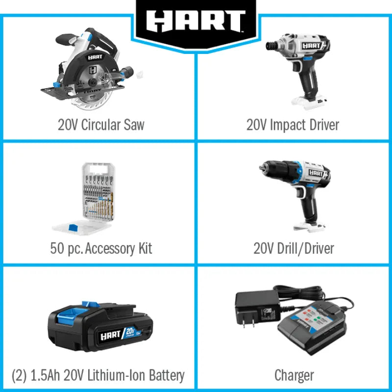 The HART 20-Volt 3-Piece Combo Kit with 50-Piece Accessory Kit is the perfect starter kit for anyone looking to complete projects in and around their home. This kit features a 20V drill/driver, 20V impact driver, 20V circular saw, and a 50-piece accessory set. Perfect for getting through a variety of materials, the Drill/Driver features a powerful motor delivering power at up to 1,600 RPM. The Impact Driver delivers up to 1,700-inch pounds of torque at up to 2,500 RPM with a quarter-inch quick-connect chuck. Making even the most demanding cuts with ease, the Circular Saw features a powerful motor that delivers up to 4700 RPM. With the included 24-Tooth, carbide-tipped, thin-kerf blade, this saw makes cuts quickly and easily through a variety of materials. All tools included run on the same HART 20V battery. Plus, with a HART 20V (2) 1.5Ah lithium-ion battery that provides fade-free power, you'll never experience a reduction in power during your projects. Take on the toughest jobs with this HART 20-Volt 3-Piece Combo Kit with 50-Piece Accessory Kit.