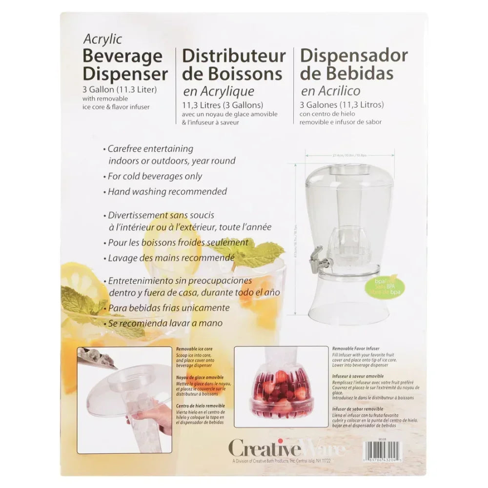 Ideal for summer gatherings and parties, this creative bath 3-gallon acrylic beverage dispenser makes entertaining a large group easy and stylish. It keeps 3 gallons of your favorite refreshing drink beautifully presented and easy to access. Made of durable yet lightweight clear acrylic, this creative bath beverage dispenser features a sturdy spigot and wide-mouth lid that makes it easy to fill with iced tea, lemonade, soda, juice, water, or your favorite adult beverage. You can also fill the base with ice for additional cooling, and the base can be removed if you so wish. An infuser is also included so you can add some fruit or herbs for some extra flavor. This creative bath 3-gallon acrylic beverage dispenser is free of BPA to protect you and everyone else in your household. It's ideal for use in your home, backyard, at the park or beach, and much more.