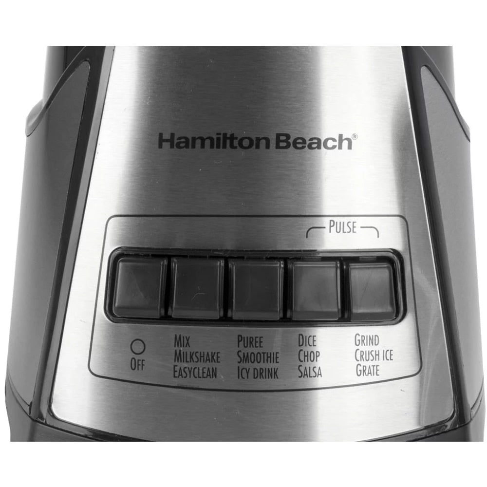 - New Hamilton Beach 58149 Blender and Chopper Two in One- Blender- 5 cup glass jar- Revolutionary Wave-Action® system continuously pulls mixture down into the blades for smooth results every time- No more ice chunks- 700 Watt peak power- Mess-free spout- Stainless steel blades- Chopper- 3 cup chopping bowl- Great for vegetables, nuts, salsa, dressings and sauces- Dishwasher safe containers- 2 speeds plus pulse- Cord storage- Stainless steel blades- Product Dimensions: 10.9 x 8.1 x 13.2 inches- Weight: 8 pounds- Product Condition: Brand new- Part Number: 58149- Warranty: 3 year manufacturer warranty
